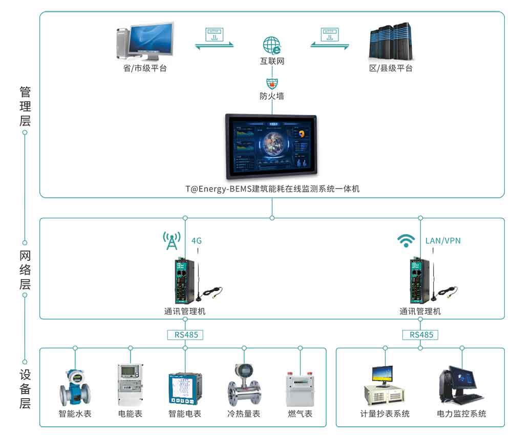 網(wǎng)絡(luò)層:以建筑內(nèi)部通訊管理機(jī)及相關(guān)網(wǎng)絡(luò)線(xiàn)路組成,通訊管理機(jī)用于末端計(jì)量表計(jì)和第三方監(jiān)測(cè)系統(tǒng)內(nèi)能耗數(shù)據(jù)的采集、存儲(chǔ)、協(xié)議轉(zhuǎn)換并上傳至“能耗管理一體機(jī)”。根據(jù)監(jiān)測(cè)點(diǎn)位的數(shù)量和位置不同,可任意擴(kuò)展通訊管理機(jī)的數(shù)量。