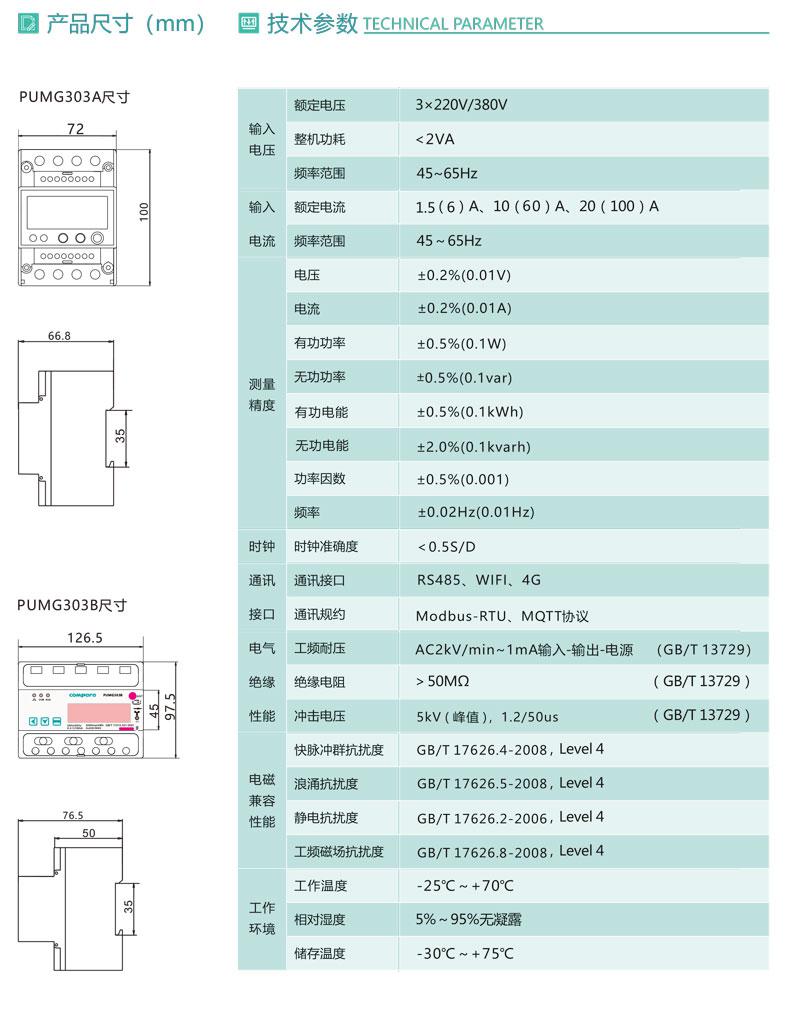 PUMG303三相導(dǎo)軌式智能電能表采用DIN35mm導(dǎo)軌式安裝結(jié)構(gòu)、LCD顯示,測(cè)量電能及其它電參量,可進(jìn)行時(shí)鐘、費(fèi)率時(shí)段等參數(shù)設(shè)置,并具有電能脈沖輸出功能;可用RS485通訊接口與上位機(jī)實(shí)現(xiàn)數(shù)據(jù)交換。該電能表具有體積小巧、精度高、可靠性好、安裝方便等優(yōu)點(diǎn),性能指標(biāo)符合國(guó)標(biāo)GB/T17215-2002、GB/T17883-199和電力行業(yè)標(biāo)準(zhǔn)DL/T614-2007對(duì)電能表的各項(xiàng)技術(shù)要求,適用于政府機(jī)關(guān)和大型公建中對(duì)電能的分項(xiàng)計(jì)量,也可用于企/事業(yè)單位作電能管理考核。