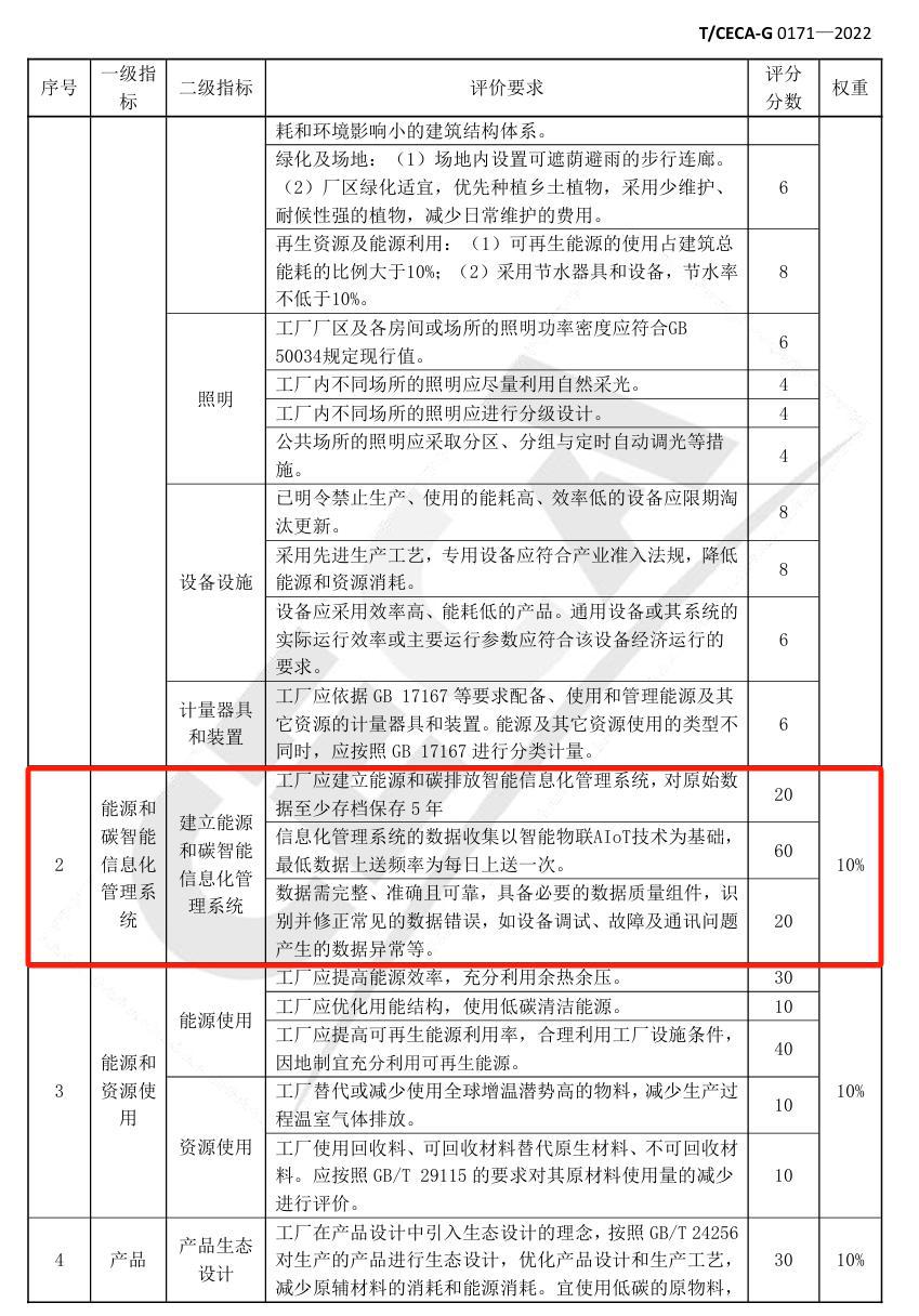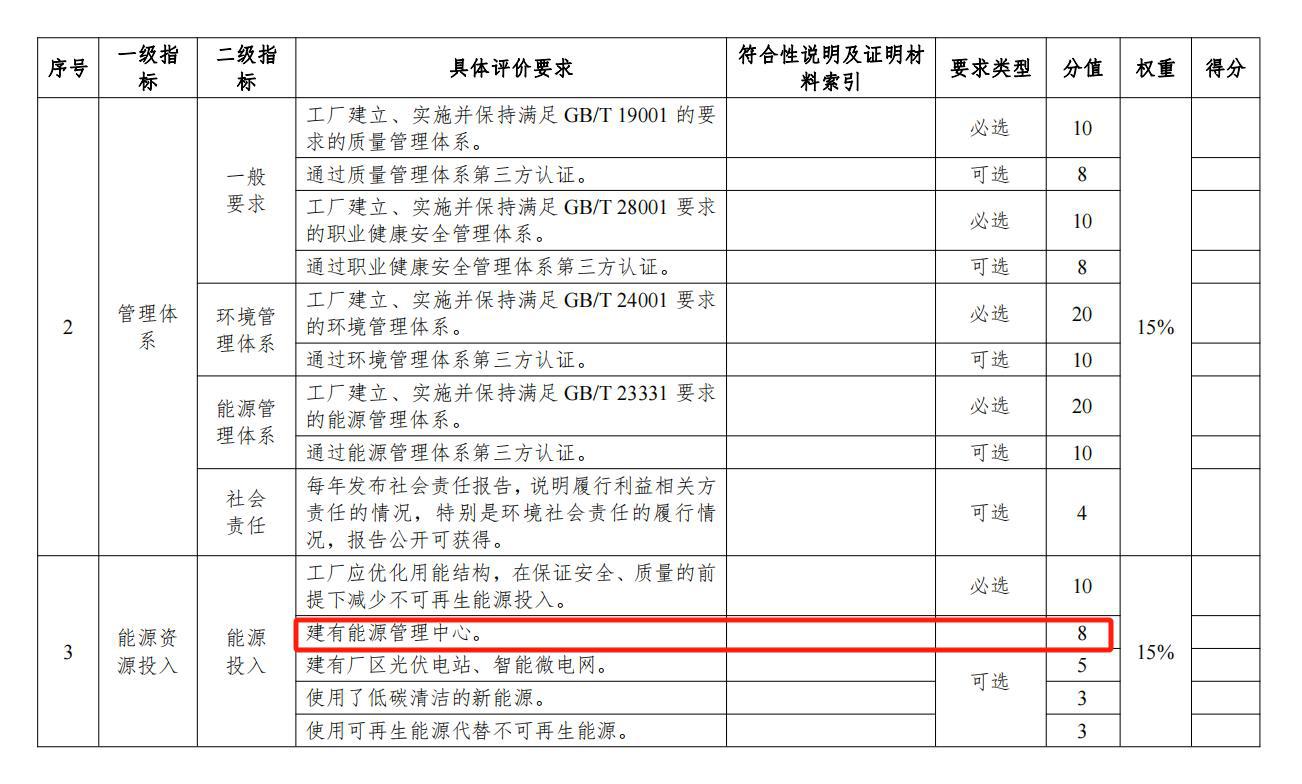 綠色工廠:根據(jù)工業(yè)和信息化部2024年1月19日關(guān)于印發(fā)工信部節(jié)〔2024〕13號(hào)《綠色工廠梯度培育及管理暫行辦法》的通知中第五章配套機(jī)制中第二十二條、第二十三條、對(duì)綠色工廠企業(yè)提供規(guī)劃布局、技術(shù)改造、專項(xiàng)資金申請(qǐng)、政府采購、試點(diǎn)示范、金融服務(wù)、品牌宣傳等方面的支持。同時(shí),附表1.1.2綠色工廠評(píng)價(jià)指標(biāo)第三方評(píng)價(jià)表一級(jí)指標(biāo)中能源資源投入的二級(jí)指標(biāo)能源投入的具體評(píng)價(jià)要求中建有能源管理中心可以+8分。如下圖: