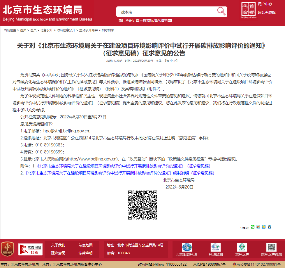北京市生態(tài)環(huán)境局官網(wǎng)6月20日發(fā)布公告,就《北京市生態(tài)環(huán)境局關(guān)于在建設(shè)項目環(huán)境影響評價中試行開展碳排放影響評價的通知》(征求意見稿)公開征求社會各界意見。