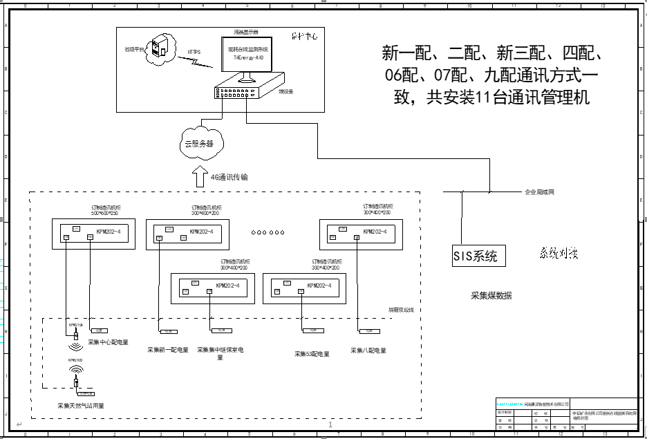 企業(yè)現(xiàn)有3條總進(jìn)線,電廠1#聯(lián)絡(luò)變和電廠2#聯(lián)絡(luò)變兩條總進(jìn)線進(jìn)線柜位于35KV開閉所配電房?jī)?nèi),需加裝2臺(tái)三相導(dǎo)軌式智能電力能效終端KPM37-W采集上傳數(shù)據(jù);金雞灘變電主進(jìn)線位于工業(yè)場(chǎng)地35KV配電房?jī)?nèi),需加裝1臺(tái)三相導(dǎo)軌式智能電力能效終端KPM37-W采集上傳數(shù)據(jù)。兩個(gè)配電房各加裝1臺(tái)4G通訊管理機(jī),將數(shù)據(jù)發(fā)送至內(nèi)網(wǎng)主機(jī)。