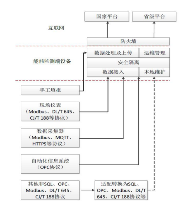 ①支持從現(xiàn)場(chǎng)的儀表獲取數(shù)據(jù):通過 Modbus(GB/T19582)、 DL/T645、CJ/T188 協(xié)議,從現(xiàn)場(chǎng)儀表采集需要的能耗實(shí)時(shí)數(shù)據(jù),并進(jìn)行匯總生成上報(bào)的能耗數(shù)據(jù);