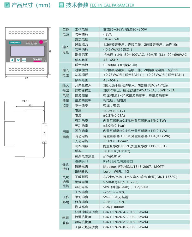 PUMG307系列三相導(dǎo)軌式智能電力能效終端采用DIN35mm 導(dǎo)軌式安裝結(jié)構(gòu)和LCD液晶屏顯示,集三相電參量測(cè)量、2~31次諧波分析、時(shí)間統(tǒng)計(jì)等于一體,標(biāo)配1路RS485通訊接口,可通過(guò)Modbus-RTU或DL/T645-2007通訊協(xié)議實(shí)現(xiàn)儀表的網(wǎng)絡(luò)化管理。還可擴(kuò)展2路開(kāi)關(guān)量輸入 和2路 繼 電 器 輸 出 , 可 外 接 開(kāi) 口 式 互 感 器 易 于 改 造 項(xiàng) 目 的 施 工 。PUMG307具有體積小巧,精度高,可靠性好,安裝方便等優(yōu)點(diǎn),多用于系統(tǒng)集成、改造工程、安裝空間有限或不便的項(xiàng)目。