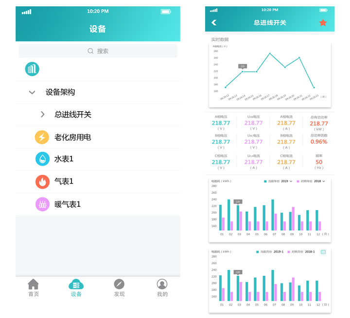 智慧能源管理系統(tǒng)App界面主要由:首頁(yè)、設(shè)備、發(fā)現(xiàn)、我的四個(gè)欄目組成。
