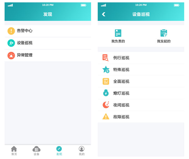 發(fā)現(xiàn)欄目側(cè)重于設(shè)備的管理以及運(yùn)維,主要涉及三部分分別是設(shè)備告警、設(shè)備巡視、異常處理;設(shè)備欄目及時(shí)推送設(shè)備告警信息,幫助運(yùn)維人員處理異常情況;設(shè)備巡視則是對(duì)巡視內(nèi)容進(jìn)行記錄與統(tǒng)計(jì);異常處理則是幫助發(fā)現(xiàn)、記錄、解決運(yùn)維過(guò)程中的不合理情況;