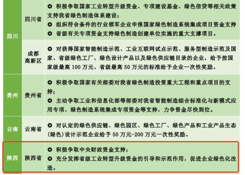 為貫徹落實(shí)《“十四五”工業(yè)綠色發(fā)展規(guī)劃》《工業(yè)領(lǐng)域碳達(dá)峰實(shí)施方案》,各省份積極響應(yīng)并分別發(fā)布了依據(jù)本地區(qū)特點(diǎn)制定的相關(guān)政策,為激勵(lì)工業(yè)企業(yè)積極進(jìn)行綠色工廠、綠色設(shè)計(jì)產(chǎn)品、綠色園區(qū)創(chuàng)建和申報(bào),大部分地區(qū)政府對(duì)于入選國(guó)家級(jí)綠色園區(qū)、工廠名單的企業(yè)給予一次性獎(jiǎng)勵(lì)100萬(wàn)元,部分城市的獎(jiǎng)勵(lì)金額更是達(dá)到了1000萬(wàn)元。關(guān)于綠色工廠,不同的省市都有不同的鼓勵(lì)性政策補(bǔ)貼,下圖是山西省份的政策補(bǔ)貼: