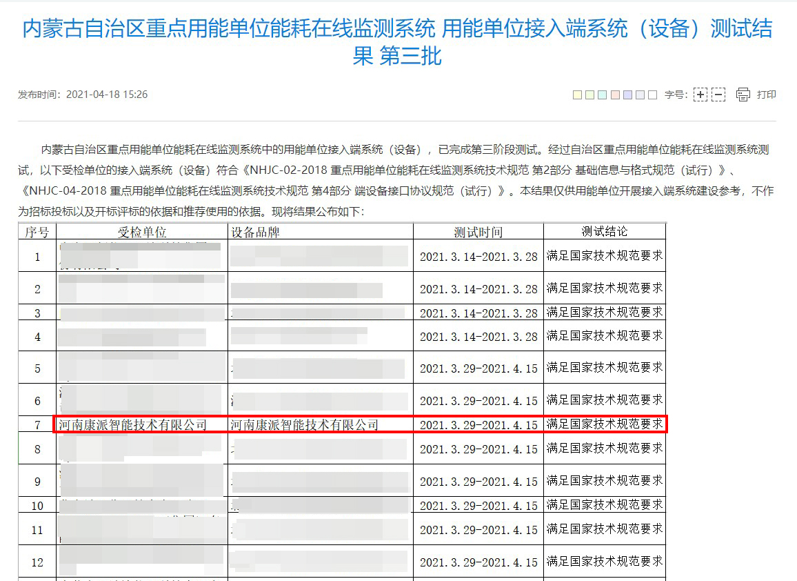 2021年4月18日,內(nèi)蒙古自治區(qū)重點(diǎn)用能單位能耗在線監(jiān)測系統(tǒng)中的用能單位接入端系統(tǒng)(設(shè)備),已通過第三階段測評(píng)。經(jīng)過內(nèi)蒙古自治區(qū)計(jì)量測試研究院測評(píng),康派智能能耗在線監(jiān)測端設(shè)備符合內(nèi)蒙古自治區(qū)重點(diǎn)用能單位能耗在線監(jiān)測系統(tǒng)技術(shù)要求。公布結(jié)果如下圖所示:
